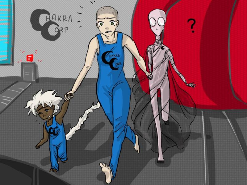 Eris and Miguri escape Chakra Corp with Alyra’s questionable assistance. Artist: Celeste DeWolfe