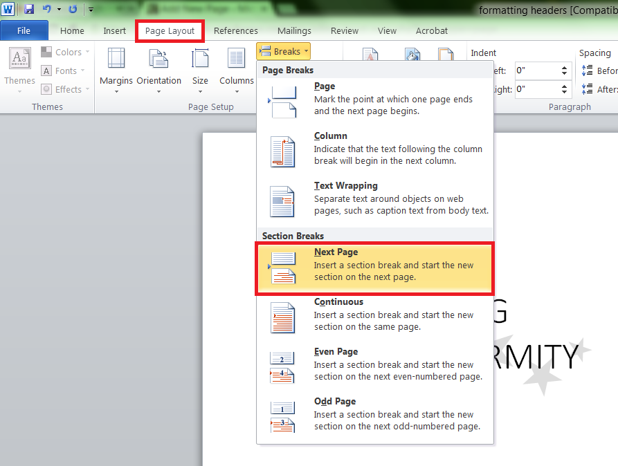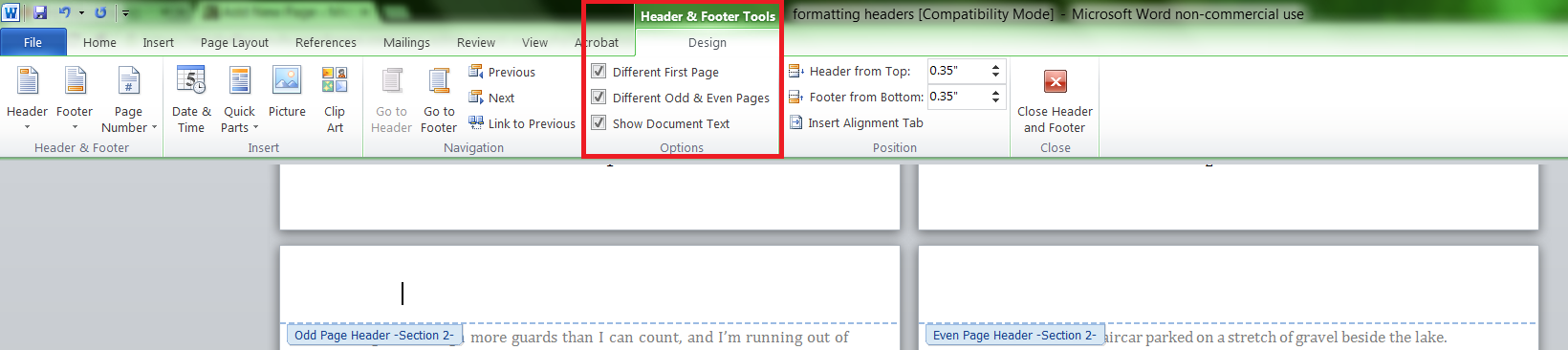 - Different First Page > This allows you to make the first page in each section have a different header than the rest of the section. The point here is to avoid having a header on the first page of the chapter, as it looks cluttered. (See this post for details)