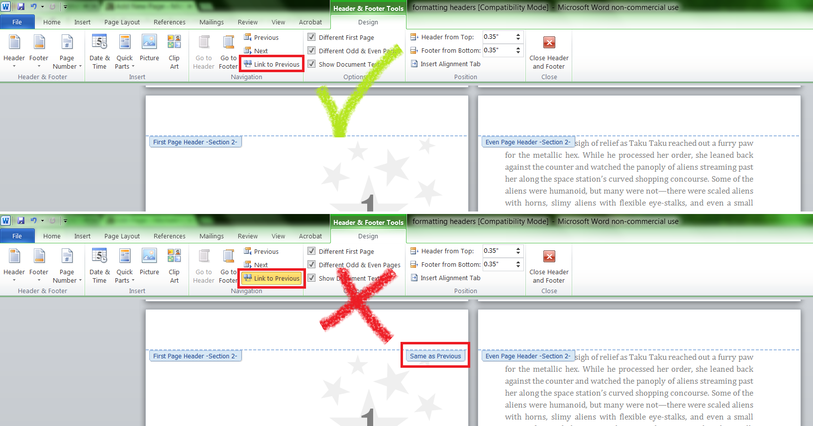 In the Header & Footer Tools tab, there’s a tricky little button called “Link to Previous”. For your first chapter, this needs to not be active. You don’t want to link your Chapter 1 header to the first section, because the first section is blank. That means your Chapter 1 header is also going to be blank. Which you don’t want. So make sure it’s not active!