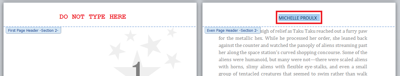 Next up, you need to actually enter text into your header. Woo! Starting on the second page (remember that we don’t want a header on the first page of the chapter), type in either your author name or your book title (depending on which side you want each one). For the sake of this example, let’s say type in your author name.